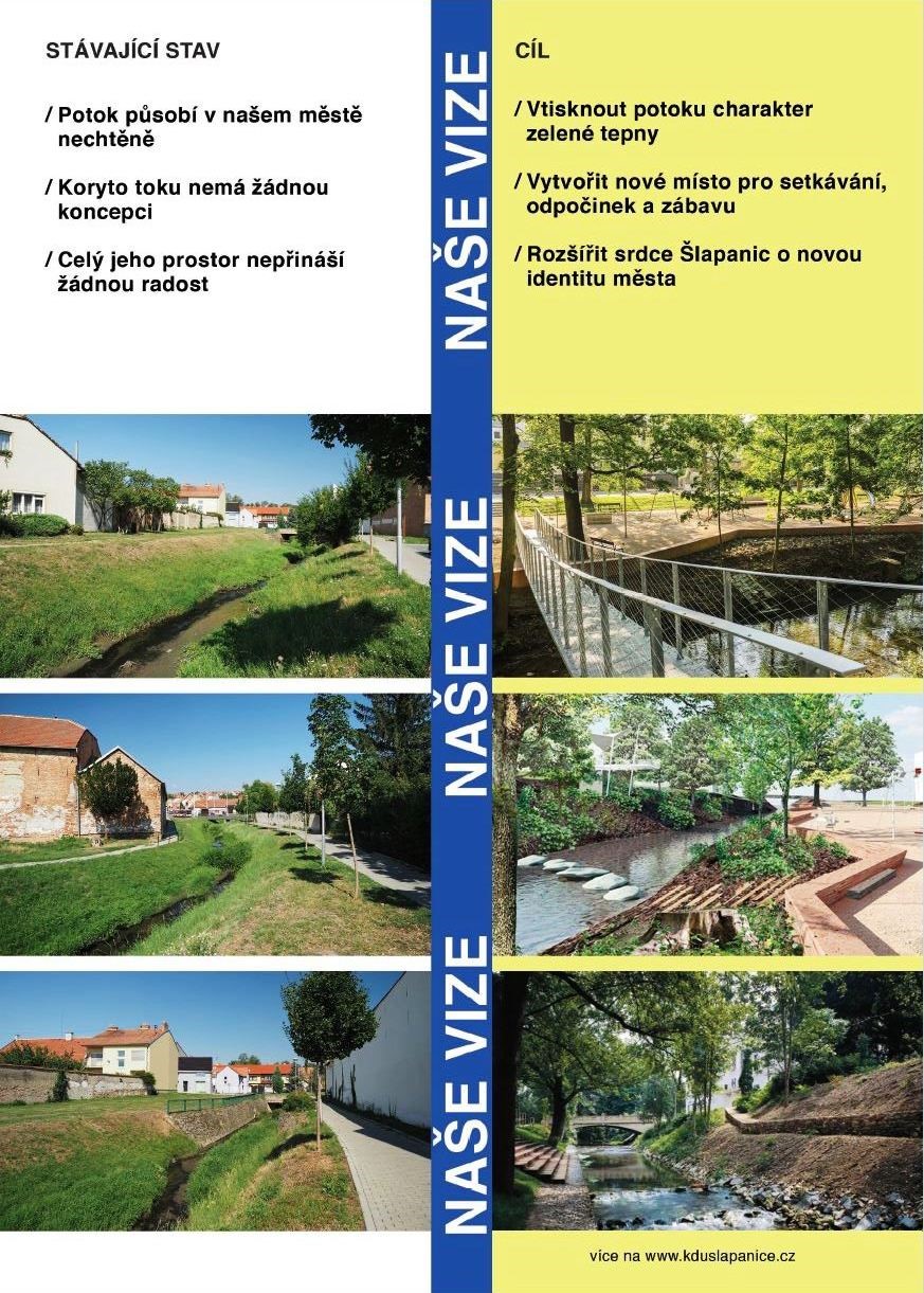 Jako téměř každá obec, jsou Šlapanice původně budovány podél vodního toku. Naši předci potřebovali mít snadný přístup k vodě a tak jim nic jiného nezbývalo. Chceme využít této přirozené tepny Šlapanic, aby se znovu stala místem, kam bude stát za to odbočit při cestě ze školy, na úřad nebo na poštu. My už si asi stínu vzrostlých stromů neužijeme, ale pojďme se do toho pustit pro ty, co přijdou po nás. Vybudujme místo, kde bude stát za to si sednout s knížkou, roztáhnout deku a položit batole nebo vzít poprvé někoho za ruku. Místo, které si naše děti nebo vnoučata budou pamatovat jako místo plné tajemných zákoutí. Místo, kde stálo za to, začít objevovat svět.